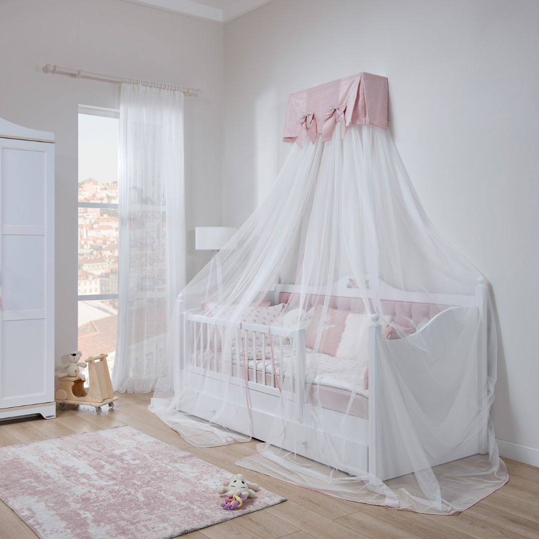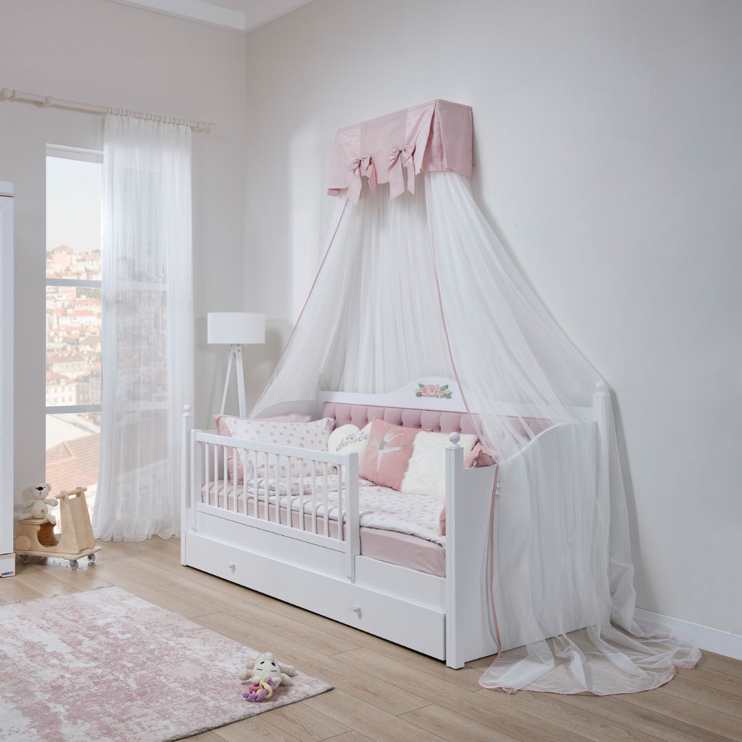 За родителя това е практична добавка: няма стойки на пода, няма опасност да се мести или да пречи при чистене, а ефектът в интериора е веднага видим. Конструкцията стои дискретно и чисто като форма, а с подходящ балдахин Queen - Ballerina се получава завършен, много нежен акцент в стаята. Идеално е и за вечери, когато искате по-спокойна рутина, приглушена светлина, по-малко „визуален шум“ и усещане за сигурност около леглото.