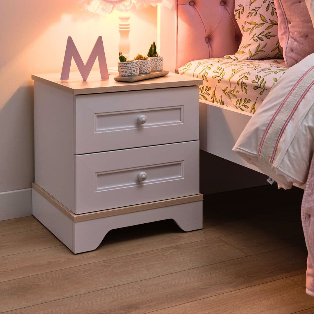 Нощно шкафче Bianca е практичното „до леглото“ решение, което помага детската стая да изглежда подредена и спокойна. Двете чекмеджета събират най-важното за вечерта и сутринта: книга, зарядно, дребни играчки, аксесоари или крем, така нищо не остава разпиляно по леглото и пода. Плотът е удобен за лампа, чаша вода или декор, а светлият дървесен акцент омекотява бялата визия и прави шкафчето по-уютно.