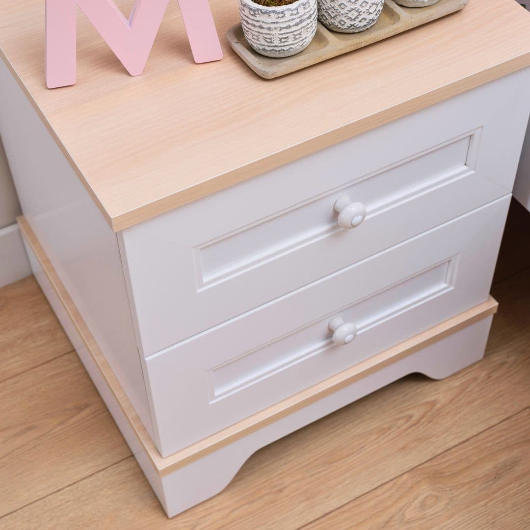 Дизайнът е в характерния за серия Bianca нежен класически стил: панелни фронтове, кръгли дръжки и стабилна основа с мека извивка. Стои красиво до легло Bianca и лесно се комбинира с пастелни текстили и светли стени, без да „натежава“ в пространството. Материалите са подбрани за ежедневна употреба - здрави мебелни плоскости с меламиново покритие, което се поддържа лесно и е подходящо за детска среда (E1 стандарт).