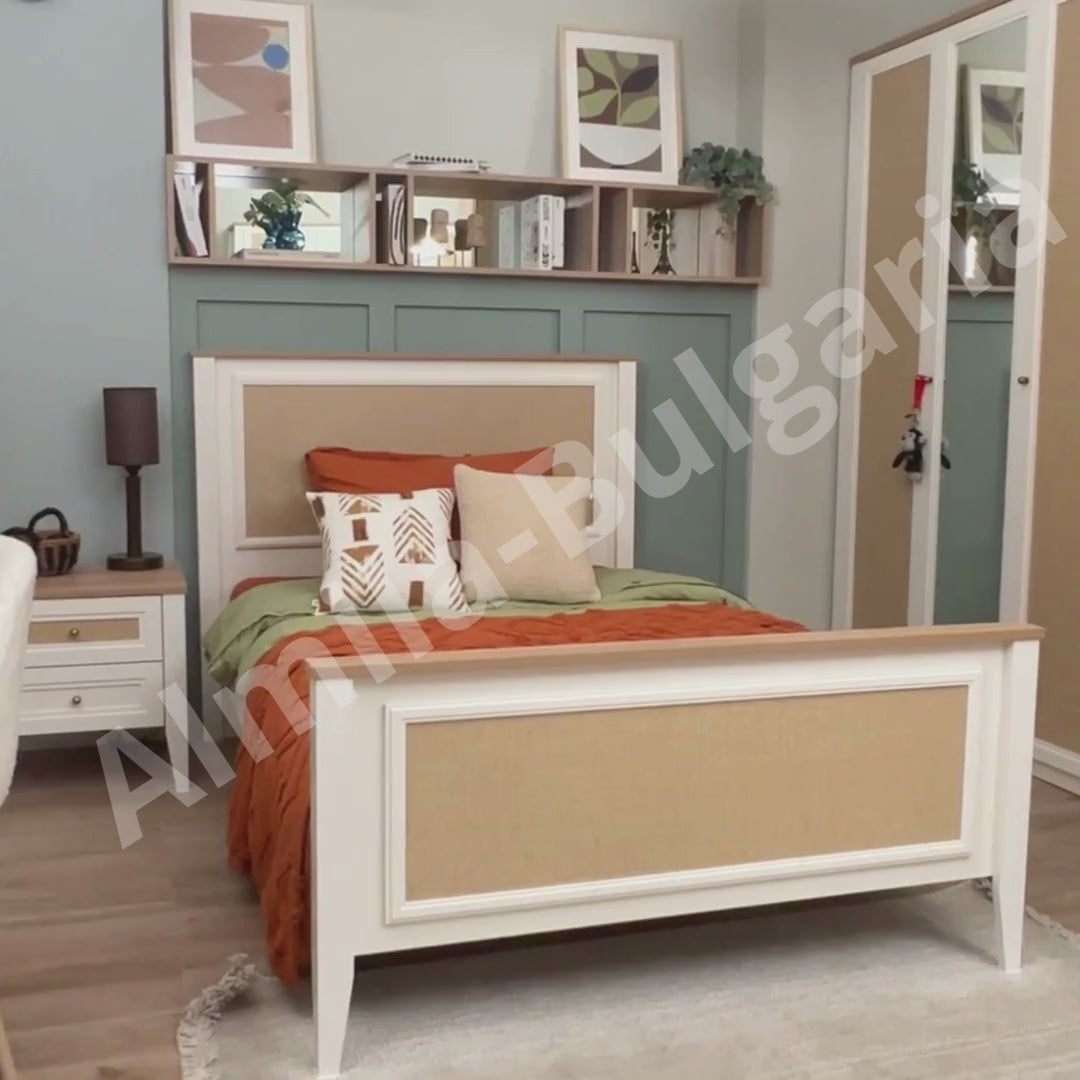 Corso е тийн легло в стил сканди-бохо – топли пясъчно-бежови акценти с имитация на ратан, комбинирани със светла рамка и чисти линии. Този тип дизайн прави стаята по-уютна и спокойна, без да изглежда претрупана. Мебелите от серия Corso се комбинират отлично с нежни пастелни цветове и декорация от естествени материали – лен, памук, плетени кошове и дървесни нюанси.