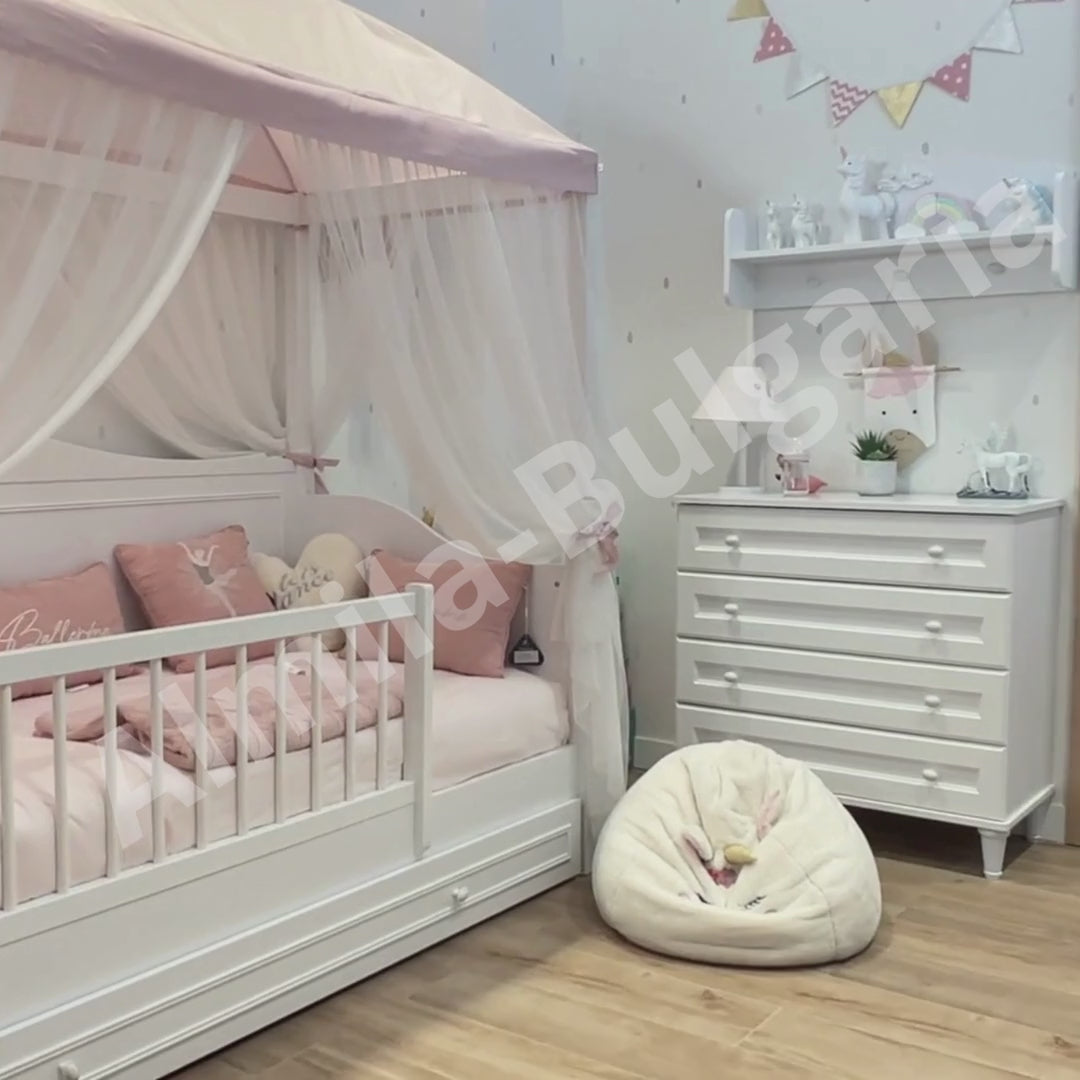 Дизайнът е класически и нежен: бяло покритие, декоративен акцент в горната част и фини профили по чекмеджето – стои красиво в светла детска стая и се съчетава лесно с пастелни текстили. Голямото предимство е долното чекмедже: с подходящ матрак то се използва като второ легло тип “сандвич” – идеално за пижама партита, приятелче на гости или по-удобно преспиване при братче/сестриче.Материалите са подбрани за детска среда – здрави мебелни плоскости с меламиново покритие, което се почиства лесно и е практично за ежедневието.