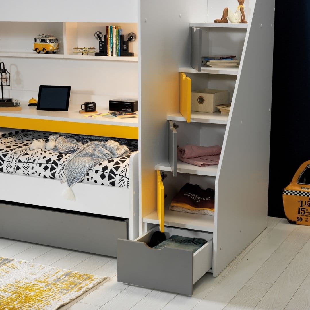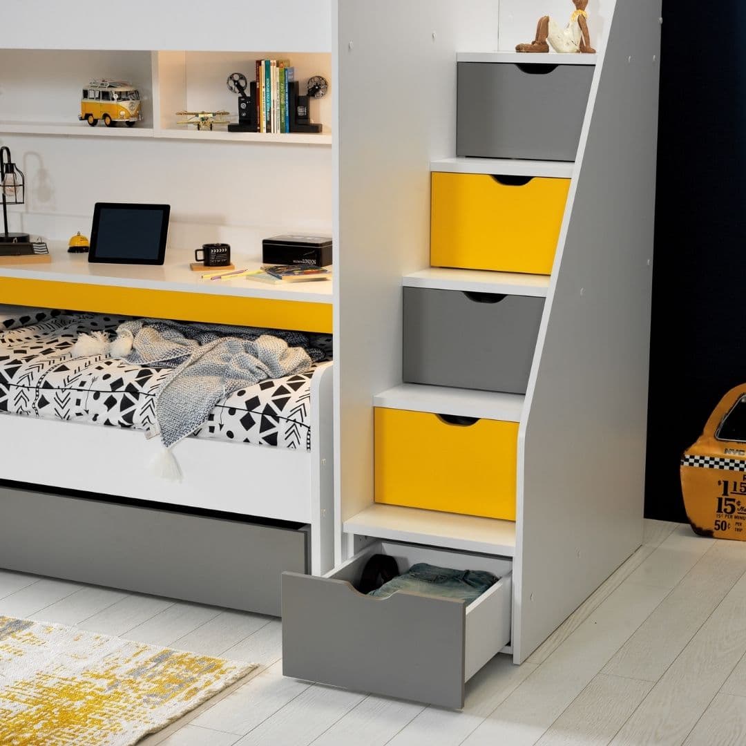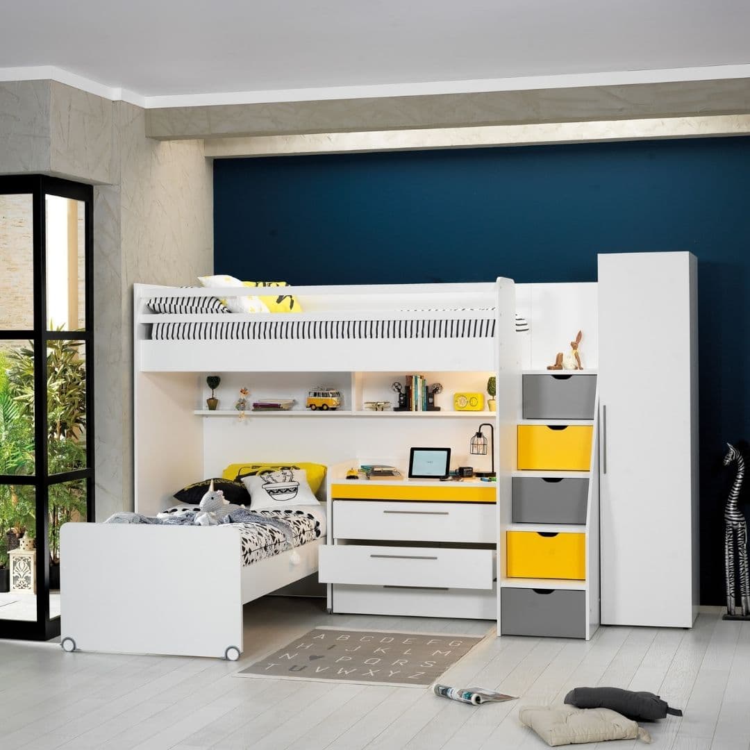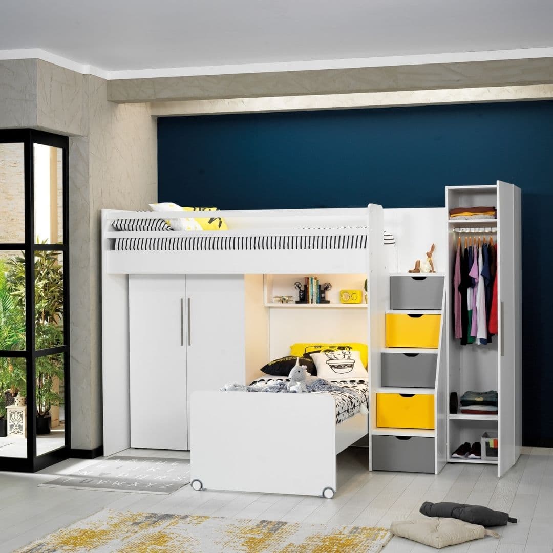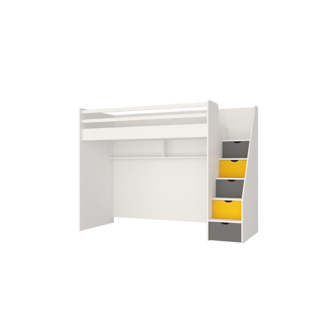Neo Yellow е лофт решение за детска стая, когато искате да спестите място, но без компромис с удобството. Горната зона е за матрак 90×200, а отдолу остава свободно пространство, което може да се използва като кът за учене, място за допълнително легло или просто за игра и движение. Така една мебел „събира“ повече функции и прави стаята по-лесна за организиране.