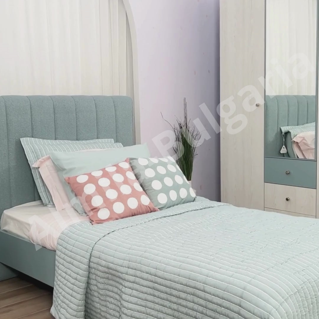 Легло Laila 120×200 е тийн легло в мек модерен (сканди) стил – светла, спокойна визия с изчистена рамка, повдигната на фини крачета, и висока тапицирана табла с вертикална прошивка, която прави къта за сън да изглежда по-завършен и „по-уютен“. В интериора стои леко и въздушно – не затрупва стаята и се комбинира лесно с пастелни цветове, бяло, бежово, светлосиво и естествени текстури (лен, памук, дървесни акценти). Размерът 120×200 дава осезаемо повече комфорт – удобно е както за спокоен сън, така и за четене и почивка, защото таблата е приятна опора зад гърба.