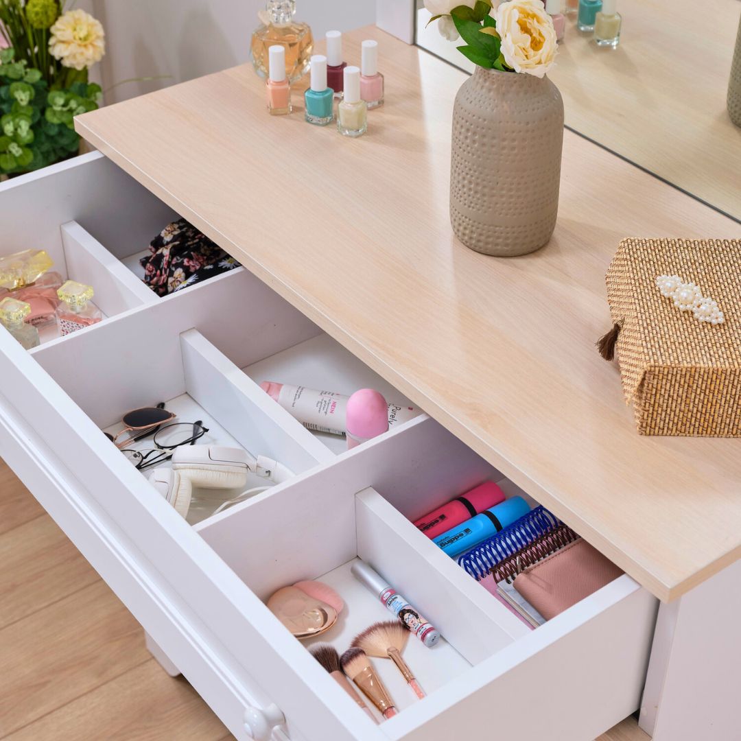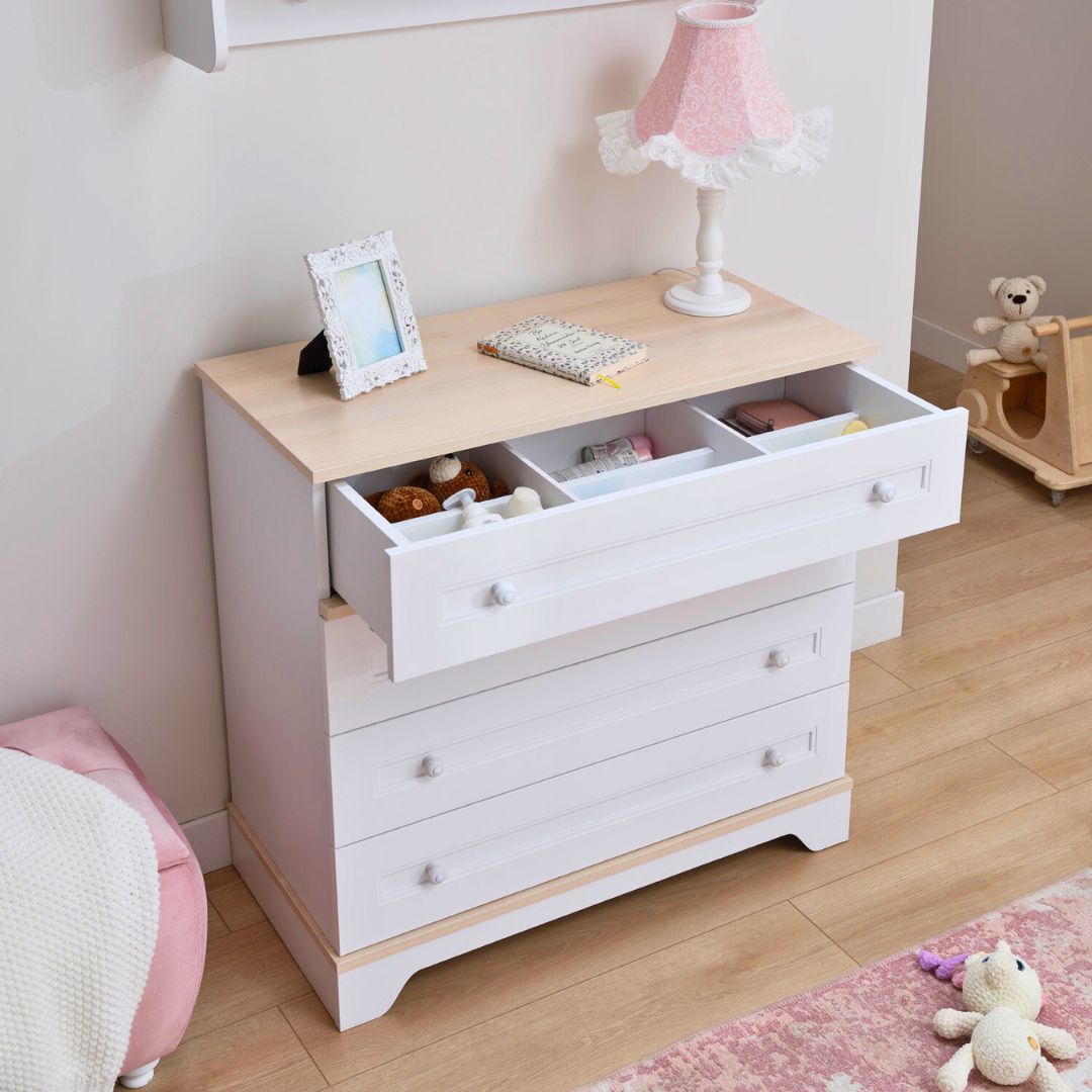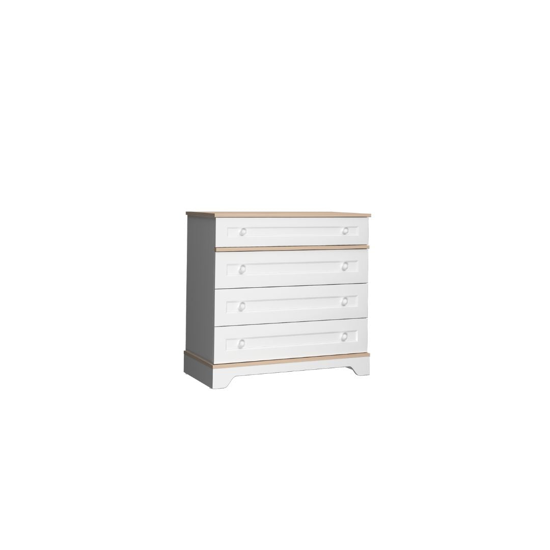 Детският скрин Bianca е онзи тип мебел, която веднага внася ред в детската стая. Разполага с 4 чекмеджета, които дават достатъчно място за дрехи, пижами, бельо и дребни играчки, всичко се прибира бързо и стаята изглежда подредена, без да „затваряте“ нещата в кутии.Горният плот е в светъл дървесен декор и е удобен за нощна лампа, рамка, кутия за аксесоари или място за дребни вещи, които искате да са под ръка. Повърхностите са с меламиново покритие, което е голям плюс за родители, почиства се лесно и не изисква специална поддръжка в ежедневието.